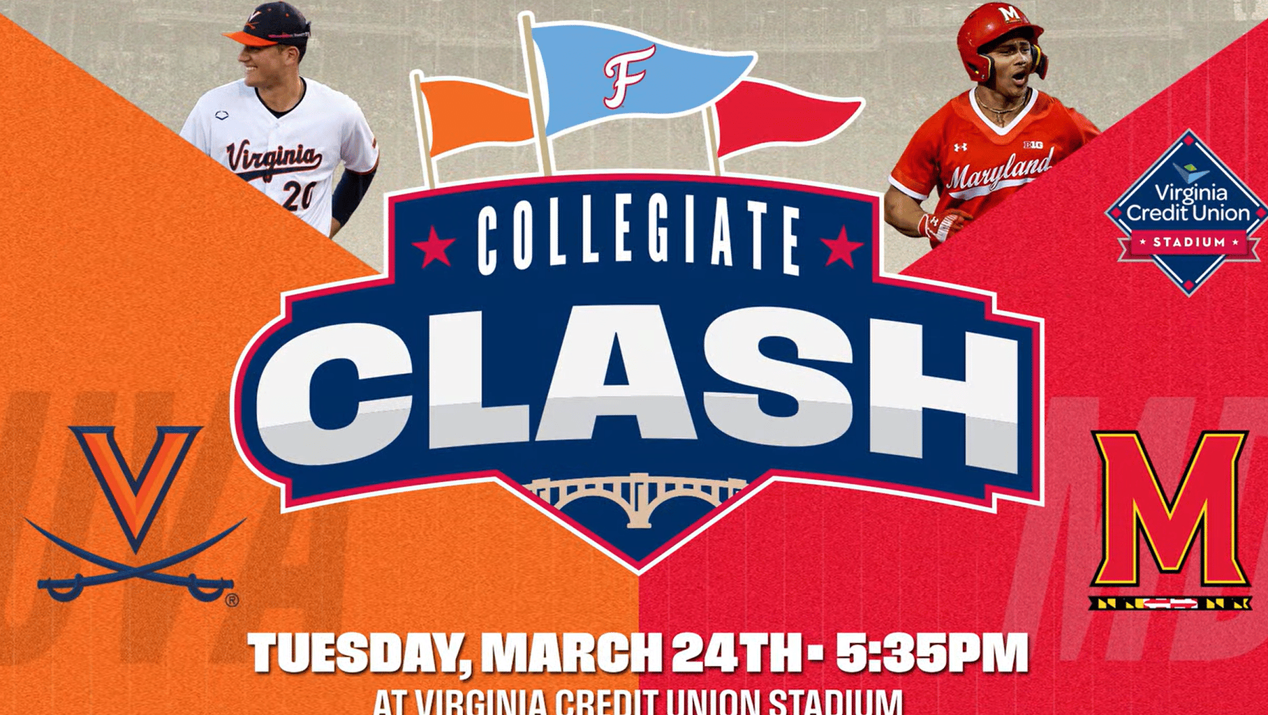 The Collegiate Clash is back and it is happening right here in our own backyard tonight. Virginia Credit Union Stadium is hosting UVA versus Maryland for the second consecutive year, renewing an old ACC rivalry that Fredericksburg gets to claim as its own. Gates open at 4:30PM with first pitch at 5:35PM. UVA comes in as the home team and the Terrapins as the visitors. It is a Tuesday night in Fredericksburg and there is no better place to be.