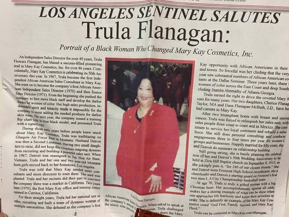 Trula Mae Flowers Flanagan was the 5th child born from the 1935 union between Marcus Ross Flowers and Fannie Verdell Elnora Williams in Chenango Community outside of Houston, Texas. Trula was born on March 31, 1943, in Angleton, Texas. In 1946, at 3 years old, Trula moved with her family to Los Angeles, California. Trula played rough and tumble with her three older brothers, Cornell, Melvin and especially Lonnie. Trula was the eldest girl in her family and remained close to her sisters Joyce and Verna her entire life. Trula attended Russell Elementary School then Thomas Alva Edison Middle School, but John C. Fremont High School was where she excelled. Trula blossomed into “girlhood” as a cheerleader, Girls’ League, class president and second place winner of a citywide baking contest with a cherry pie. She lost her campaign for student body president, despite having boyfriend Detroit Flanagan as her campaign manager, using a slogan “Trula Flanagan - tiny, talented, petite personality, plus!” Nonetheless, she had cemented a lifelong partnership with her best friend, Detroit, in 1959 who later became her husband on September 1, 1963 when they married at Zion Hill Baptist Church when it was located at 51st and McKinley Avenue in Los Angeles. While Detroit attended Loyola University of Los Angeles (then an all mens’ university and presently Loyola Marymount University), Trula was attending Los Angeles City College studying business. Upon Detroit completing his math degree and ROTC commitment, the couple received their commission from the United States Air Force and were stationed at Lowry Airforce Base in Denver, Colorado in 1965. The couple then received orders to report to Glasgow Airforce Base in Glasgow, Montana. On January 25, 1966, daughter Cherice Monai Flanagan joined their family, and one year later, on February 8, 1967, the fearsome foursome was complete when a second daughter, Dana Lynn Flanagan, was born. Desiring to upgrade their living standard for the sake of their children, Trula accepted the Mary Kay Cosmetics opportunity to become a Beauty Consultant in May 1967 becoming the first African American beauty consultant in the company. Out of the gate, Trula was excelling in both sales and recruiting even though she had little to no experience wearing cosmetics!
